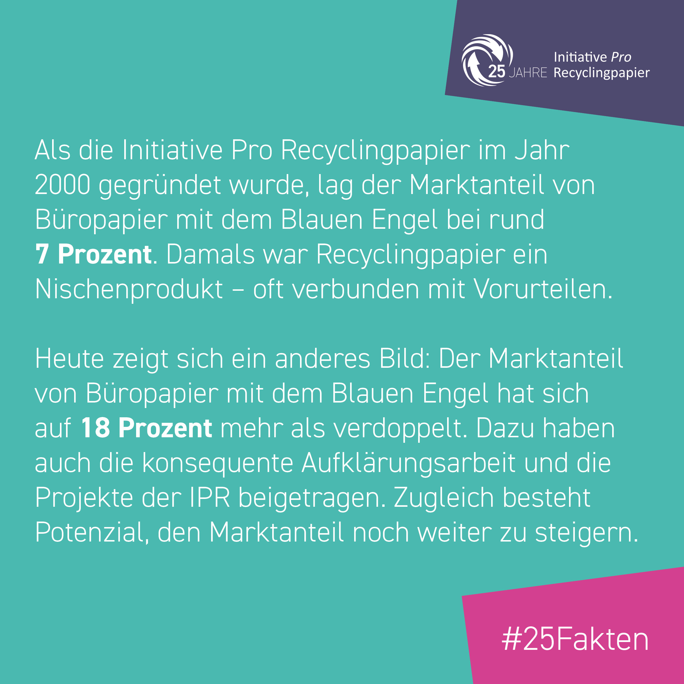 Seitdem ist viel passiert. Es gibt eine aktualisierte Ökobilanz, die die Ergebnisse von 2000 erneut bestätigt. Unser Mitgliederkreis ist auf 25 Unternehmen angewachsen. Und mit zahlreichen Projekten und Kampagnen ist es uns gelungen, Vorurteile abzubauen und den Einsatz von Recyclingpapier in Unternehmen und öffentlichen Verwaltungen zu fördern.